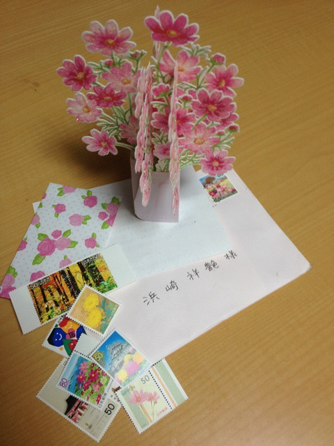 今月も、Kちゃんから、ご祈願代と、お手紙、季節の切手が入っていました。そして、可愛いコスモスも