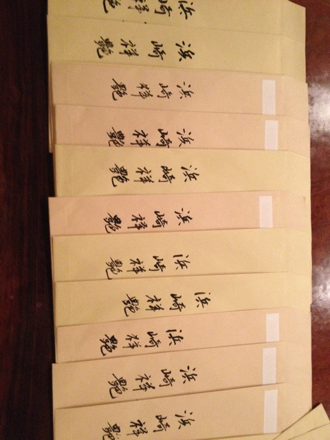 ママが、やっと書き上げたーと、写メ撮ってます。🐶そしたら、御幣の紙が少ない事に気づいて、あわてて、宮崎の高千穂に行く人に、SOS